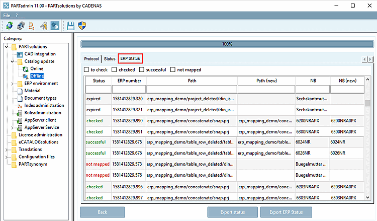Es wird für alle betroffenen ERP-Nummern der Status (geprüft [checked], erfolgreich [successful], ausgelaufen [expired] und nicht gemappt [not mapped]) angezeigt, außerdem Pfad [Path], Pfad (neu) [Path (new)], NB und NB (neu) [NB (new)].