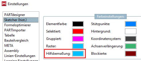 In PARTdesigner -> Extras-Menü -> Einstellungen... -> Sketcher (hist.) -> Farbeinstellungen -> Hilfsbemaßung kann die Farbe der Hilfsbemaßung einstellt werden.