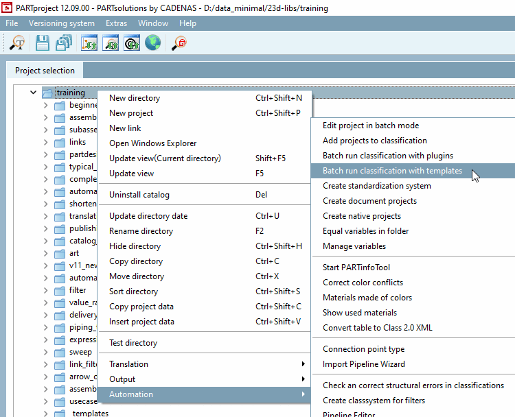 oder über ein Verzeichnis im Strukturbaum per Kontextmenübefehl Batchlauf Klassifizierung mit Templates [Batch run classification with templates].