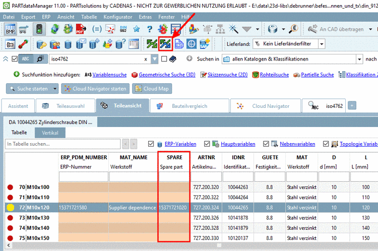 (Ersatzteil)In der Spalte SPARE kann die ERP_PDM_NUMBER eines anderen Teils eingetragen werden. Mit Klick auf den Button