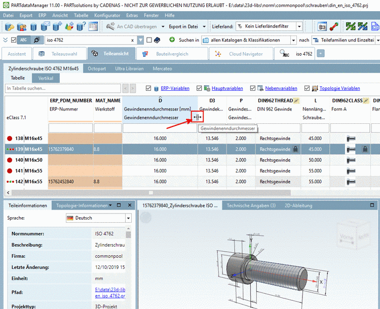 Mit V11 SP9 können Sie Spaltenbreiten in der Sachmerkmalstabelle von PARTdataManager oder PARTdesigner einstellen. Führen Sie hierzu die Maus über die Grenze zwischen zwei Spalten, sodass der Anfasser erscheint. Ziehen Sie dann die Breite auf die gewünschte Größe. Nach einem Bauteilwechsel oder dem Ausführen einer Suche wird wieder die Defaultbreite angezeigt.