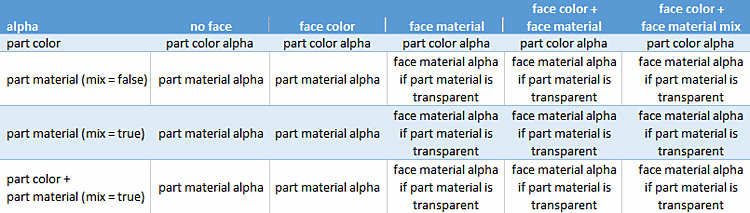 Die Matrix betrachtet die Verwendung von Transparenz [Transparency] bei verschiedenen Einstellungen von part color und part material in Relation zu verschiedenen Einstellungen von face color und face material.