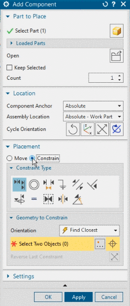 Öffnen Sie das Listenfeld unter Assembly Location und selektieren Sie Absolute - Work Part.