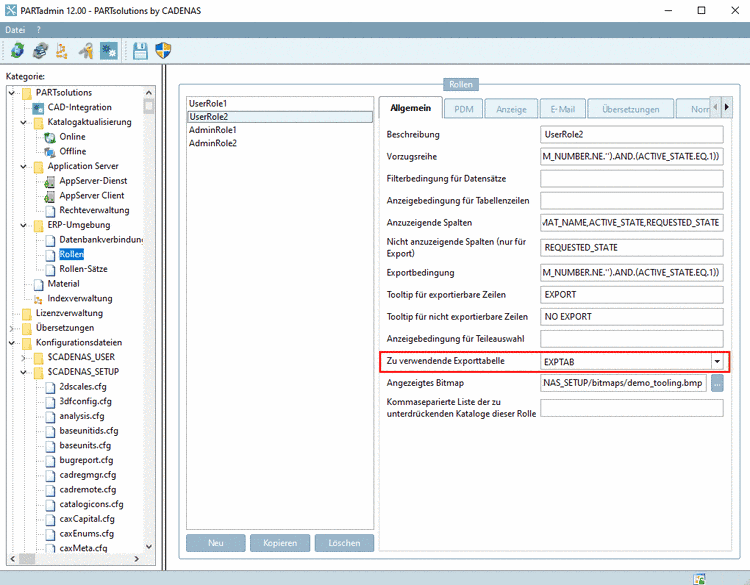 Zu verwendende Exporttabelle ist rollenabhängig und muss somit für jede Rolle separat definiert werden. | |