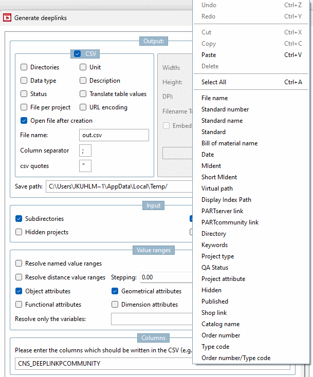 Folgende Variablen können kommasepariert im Eingabefeld eingegeben werden. Sie müssen die korrekten Eingabenamen nicht auswendig kennen. Wählen Sie die gewünschten Variablen einfach per Kontextmenü aus. Darüber hinaus ist auch die Eingabe von Tabellenvariablen oder "CNS_" Projektvariablen möglich