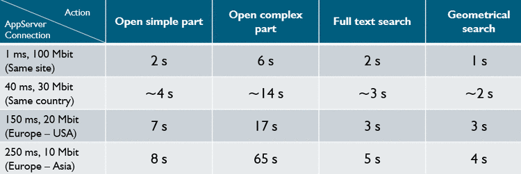 Die folgende Tabelle zeigt typische PARTsolutions-Aktionen in verschiedenen Latenzzeit / Bandbreite Umgebungen.