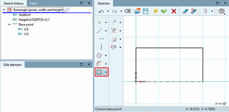 Klicken Sie auf den Button Rechteck einfügen [Insert rectangle]. Die Breite des Rechtecks ist später die Höhe der Hutmutter und die Höhe des Rechtecks stellt den Rohkörper für den halben Sechskant dar (Achtung: Gemeint ist hier der Außendurchmesser des Sechskants, nicht die Schlüsselweite).