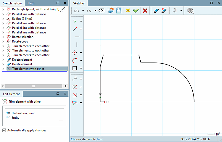 Entfernen Sie mittels der Funktionen Elemente aufeinander trimmen [Trim elements to each other], Element löschen [Delete element] und Element auf ein anderes trimmen [Trim element with other] alle überflüssigen Linien.