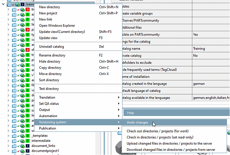 Unter Versionsverwaltung [Versioning system] findet sich der Befehl Änderungen rückgängig machen [Undo changes]. Damit werden alle lokalen Änderungen rückgängig gemacht (also die lokalen Dateien wieder auf den Stand gesetzt, der bereits auf dem Server eingecheckt ist). Die lokalen Änderungen können Sie anhand der roten Häkchen prüfen.