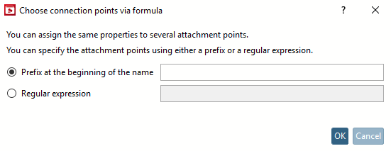 Bei einer großen Menge von Anfügepunkten, die gleich zu klassifizieren sind, ist die Verwendung eines Präfix bzw. regulären Ausdrucks sinnvoll. Auf diese Weise muss nur einmal für die spezifizierte Punktemenge klassifiziert werden. Verwenden Sie hierzu den Kontextmenübefehl Anfügepunkte über Formel auswählen [Choose connection points via formula].
