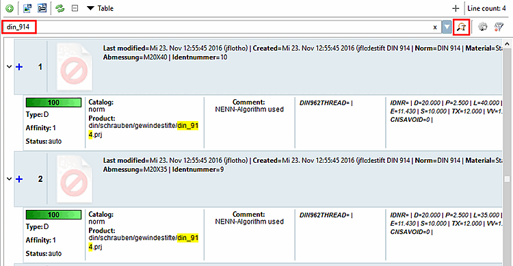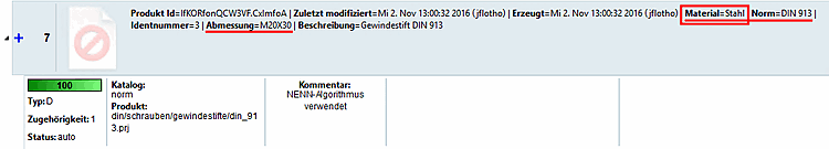 Durch Berücksichtigung der Materialspalte konnte das Produkt DIN 913 mit der Ausprägung M20x30 differenziert mit unterschiedlichen Materialien zugewiesen werden.