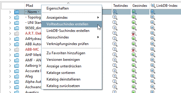 Für alle Toplevel-Verzeichnisse (norm, <Kataloghersteller>, Eigenteilkataloge.) kann der Index für die Volltextsuche für den selektierten Katalog im Ganzen erstellt werden. Auf Unterebenen steht der Befehl nicht zur Verfügung.