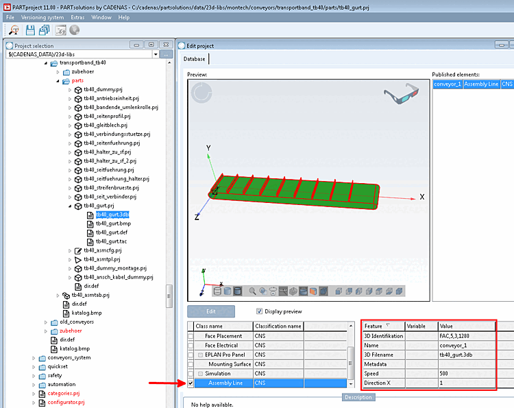 Selektieren Sie im Konfigurator [Configurator] das zu klassifizierende Einzelteil in der Baugruppe (bei einem Förderband den Gurt) und öffnen Sie es mittels Kontextmenübefehl in PARTproject.