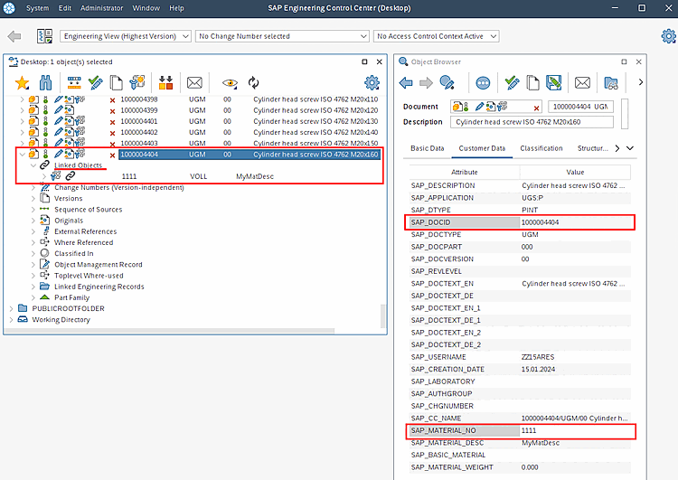 -> Unter Linked Objects wird die automatisch generierte und hochgezählte Materialnummer SAP_MATERIAL_NO angezeigt.