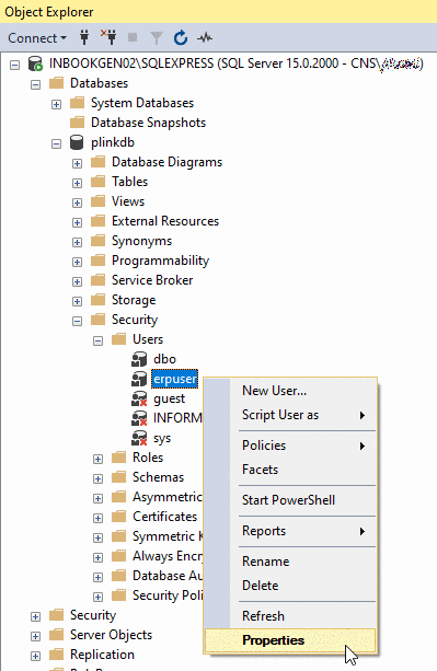 Abschließend müssen Sie nun noch den „erpuser“ mit den gewünschten Rechten ausstatten: Rechtsklick auf „erpuser“ -> "Eigenschaften"