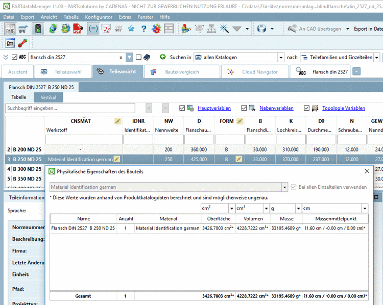 Physikalische Eigenschaften in PARTdataManager nachsehen