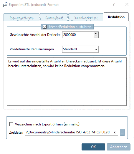 Auf der Registerseite Reduktion kann nicht nur hart auf eine bestimmte Anzahl von Dreiecken abgestimmt werden, sondern auf die gewünschte Ergebnisqualität.