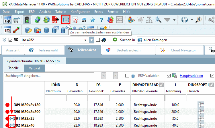 In den DIN, EN und ISO Datenblättern (ebenso anderen Ländernormen) sind bestimmte Größen desöfteren als zu vermeiden deklariert. Sofern die Option administrativ aktiviert wurde, werden "zu vermeidende Teile" im PARTdataManager, in der Teileansicht gekennzeichnet.