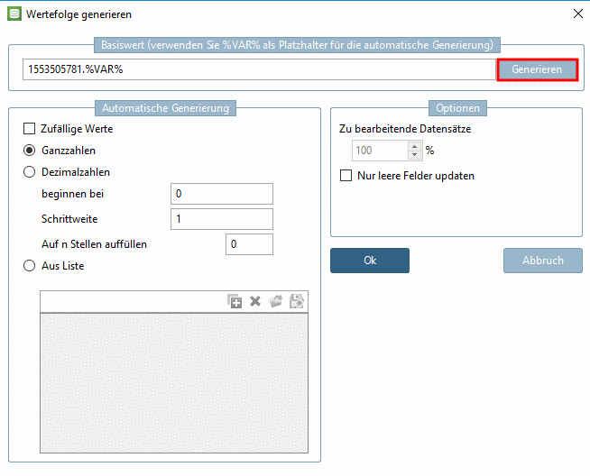 Es öffnet sich das Dialogfenster Wertefolge generieren.