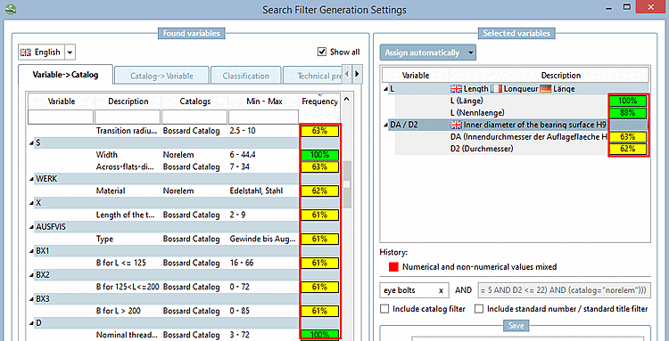 Im Dialogfenster Suchfiltergenerierungseinstellungen [Search Filter Generation Settings] sehen Sie links den Dialogbereich Variablen gescannter Teile [Found variables] mit Variablennamen, Beschreibungstexten, Herkunftskatalogen und Wertebereichen und rechts den Dialogbereich Ausgewählte Filtervariablen [Selected variables], welcher zunächst leer ist. Die Auswahl derjenigen Variablen, die in den Suchfilterassisten übernommen werden soll, erfolgt per Drag & Drop. Ziehen Sie die gewünschten Variablen einfach ins rechte Feld. Die Reihenfolge ändern oder löschen führen Sie per Kontextmenübefehl aus.