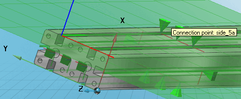 In der 3D-Vorschau kennzeichnet die grüne Koordinatenachse die Einfügelinie [Connection line] . Das Pyramidensymbol , welches in der 3D-Vorschau für Anfügepunkte benutzt wird, ist identisch für Einfügelinien verwendet.