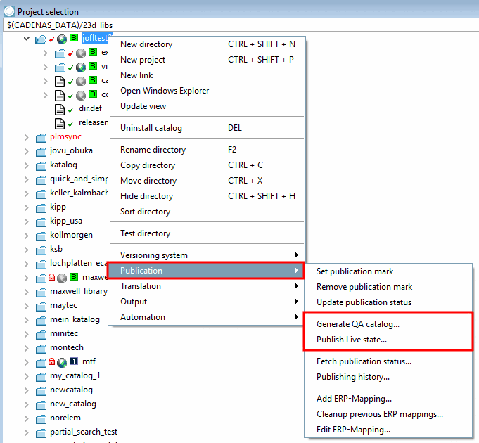 Klicken Sie auf dem Katalogverzeichnis den Kontextmenübefehl unter Publizierung [Publication] -> QA Stand generieren... [Generate QA catalog...], bzw. Live Stand publizieren... [Publish Live state...].