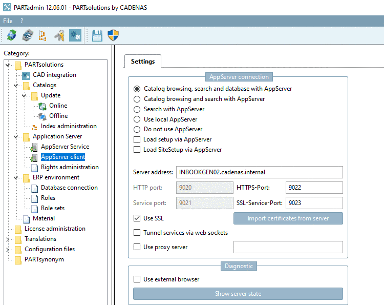 Standardmäßig ist auf der Registerseite Einstellungen unter Verbindung zum AppServer die Option Kataloge, Suche und Datenbank über AppServer eingestellt.