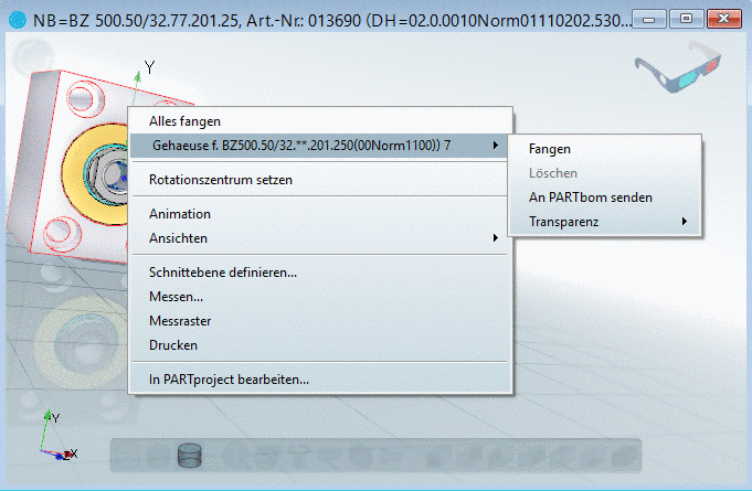 Öffnet ein Untermenü mit den Funktionen Fangen, Löschen, An PARTbom senden, Transparenz.