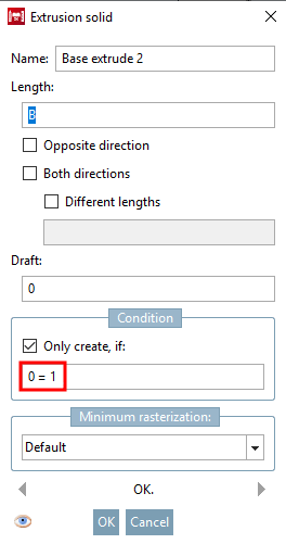 Öffnen Sie Base extrude 3. Hier wurde zu der zuvor schon bestehenden Bedingung "C=6" mit "&" die ungültige Bedingung "0=1" angefügt.