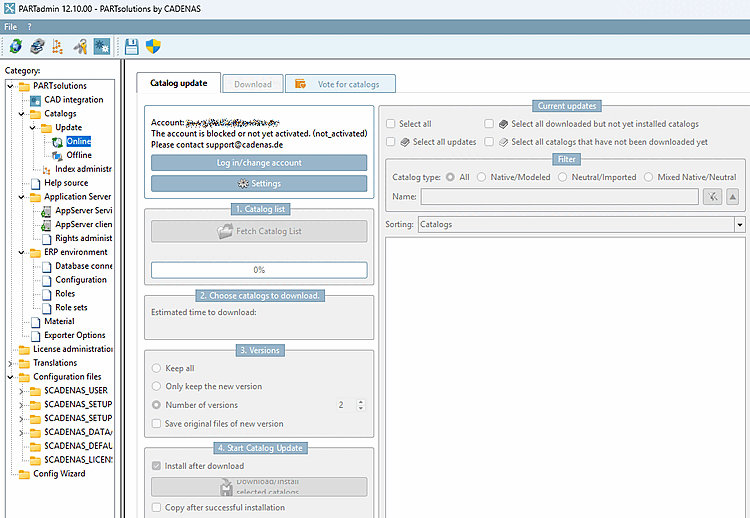 Beim initialen Login ist die Registerseite Katalogupdate [Catalog update] ausgegraut und über dem Button Einloggen/Konto wechseln [Log in/change account] erscheint "Sie haben noch keinen Login für die Katalogupdates durchgeführt. [You have not yet logged in for the catalog updates.]".