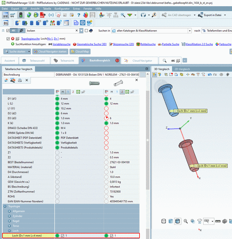 Per Default ist die Anzeige der topologischen Informationen im Bauteilvergleich ausgeschaltet. Wenn aber Suchergebnisse einer Topologiesuche geöffnet werden, dann sind die topologischen Merkmale unter Tabellarischer Vergleich bereits gekennzeichnet, die entsprechenden Auswahlkästchen bereits selektiert und die entsprechende Information im 3D-Vergleich ebenfalls angezeigt.