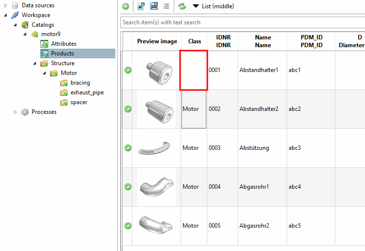 Selektieren Sie im Struktur [Structure]-Baum die Klasse, welcher das Produkt zugewiesen war. Das Produkt wird nun wieder angezeigt (als geändert