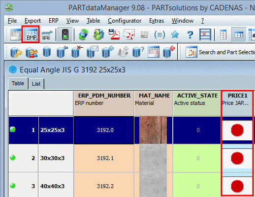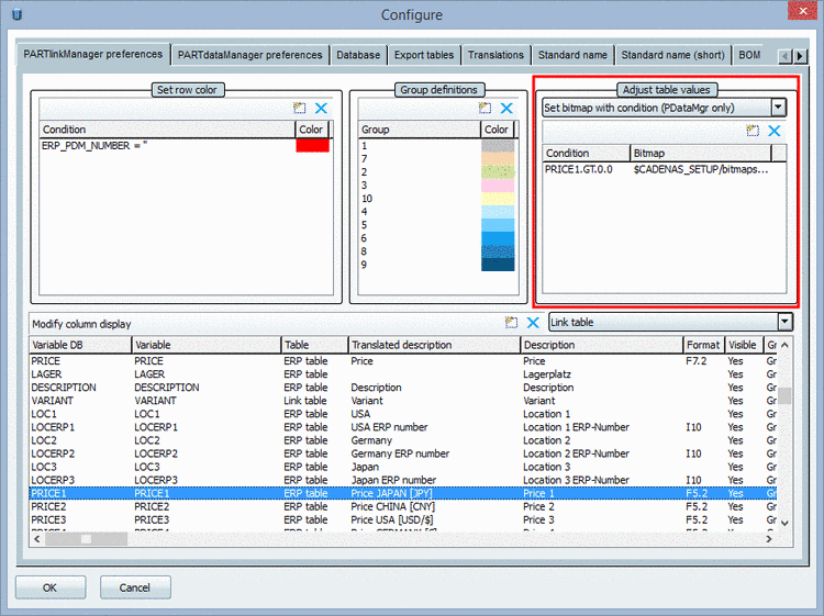 Setting in user interface under PARTlinkManager -> Extras menu -> Configure dialog box -> PARTlinkManager preferences tab -> Adjust table values -> Set bitmap with condition (PDataMgr only)