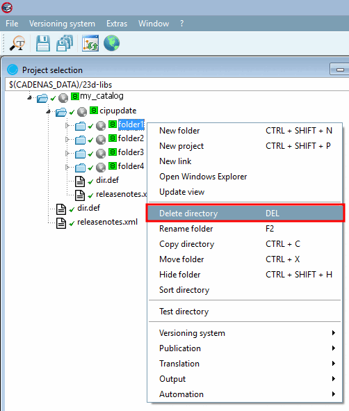 Nachdem Sie das Verzeichnis/Projekt mittels Kontextmenü -> Verzeichnis löschen [Delete directory] bzw. Projekt löschen [Delete project] gelöscht haben, wird das entsprechende Verzeichnis/Projekt mit dem Symbol "D" für "deleted" angezeigt.