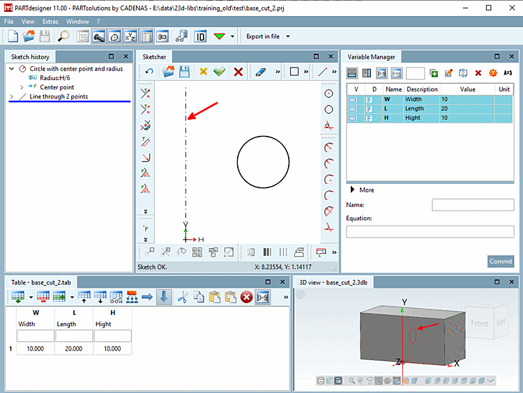 -> In der 3D Historie [3D History] erscheint ein weiterer Punkt (Feature): Cut extrude 1.