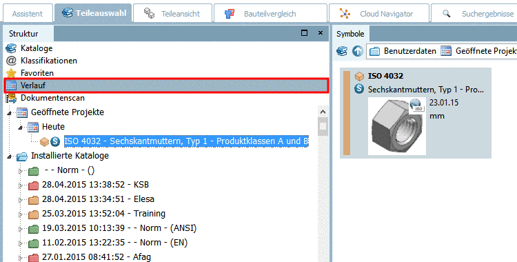 Nach der Installation können Sie Projektänderungen detailliert prüfen im PARTdataManager unter Teileauswahl -> Verlauf -> Installierte Kataloge.