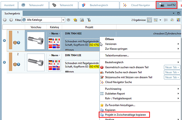 Diese Befehle stehen auf Projektebene und innerhalb der Suchergebnisse zu Verfügung. Hiermit laden Sie Bauteile in den Bauteilvergleich [Part comparison].