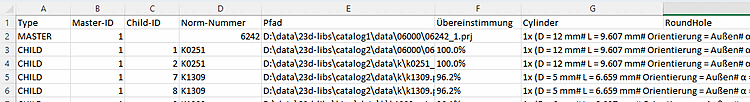 CSV-Beispielergebnistabelle mit Standardvariablen und Variablentyp "Topologie" mit zwei Attributen (Cylinder und RoundHole):