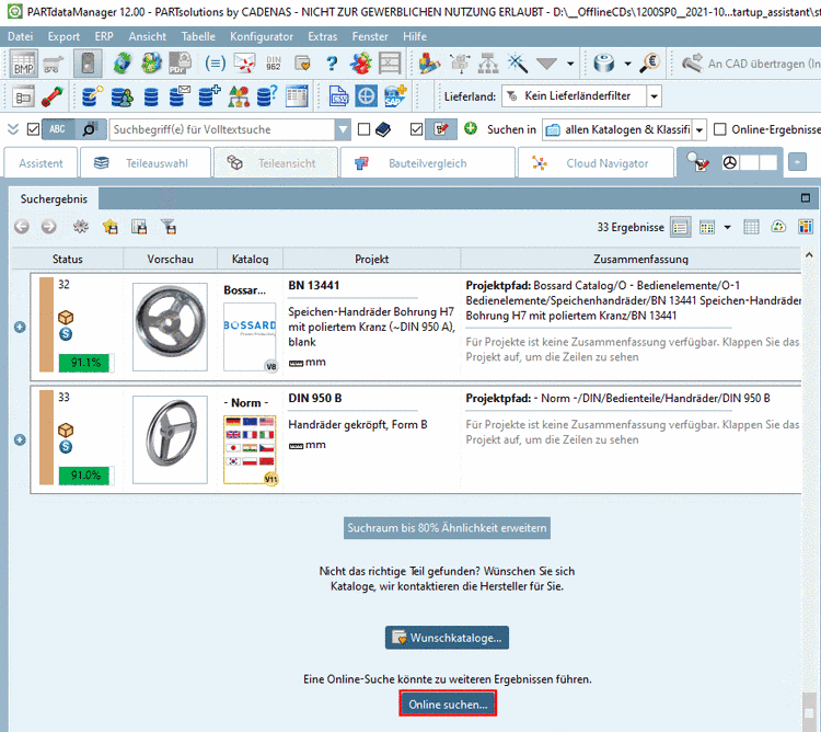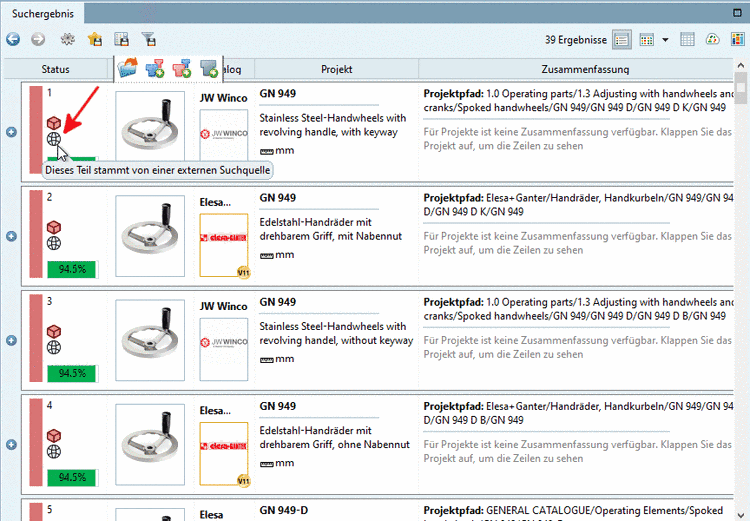 Externe Ergebnisse können zwar geöffnet werden, aber alle Aktionen wie Übergabe ans CAD, etc. sind deaktiviert. Sollen entsprechende Teile verwendet werden, laden Sie entweder das entsprechende Teil auf dem Portal herunter oder installieren Sie den entsprechenden Katalog nachträglich via PARTadmin lokal.