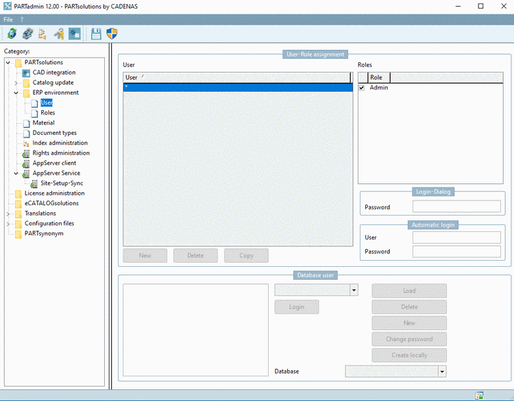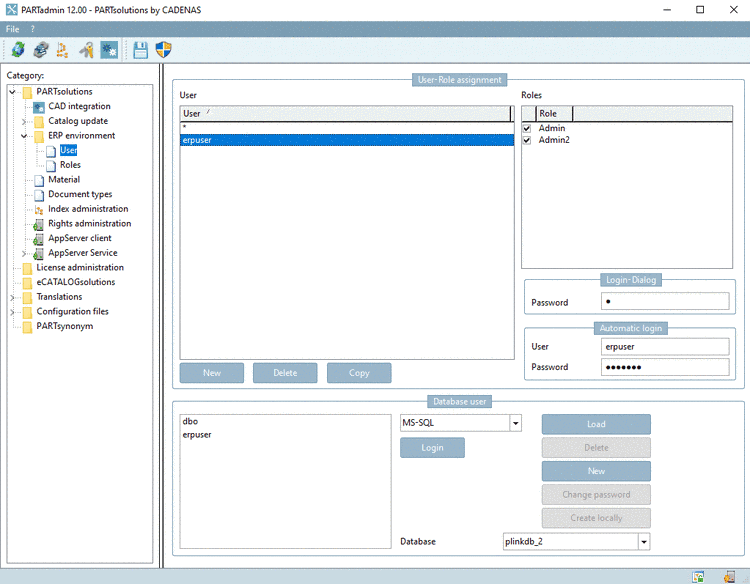 Check if database Login works and create an user "erpuser" with passwords for Login-Dialog and Automatic login. Create two roles (here "Admin" and "Admin2").