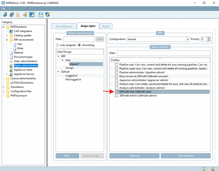 If this user (here "erpuser") shall use 3Dfindit, make sure that under Known profiles "3DFindit User" is enabled.