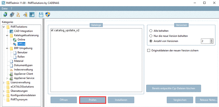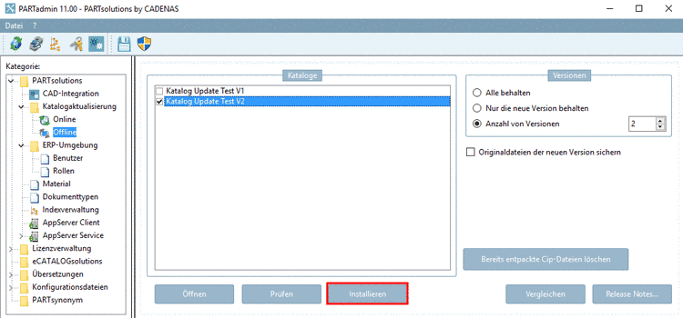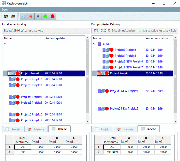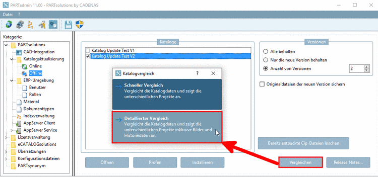 Unter PARTadmin -> Kategorie "Katalogaktualisierung" -> "Offline" -> "Vergleichen" sehen Sie einen Katalogvergleich mit Anzeige der Verzeichnisstruktur und Tabelle. Änderungen der Verzeichnisstruktur sind sofort ersichtlich.