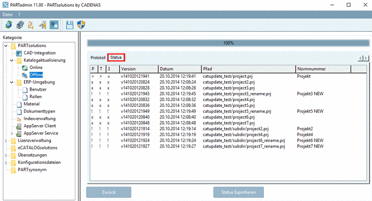 Unter PARTadmin -> Kategorie "Katalogaktualisierung" -> "Offline" -> "Prüfen" -> Registerseite "Status" erhalten Sie eine Liste aller Projekte.