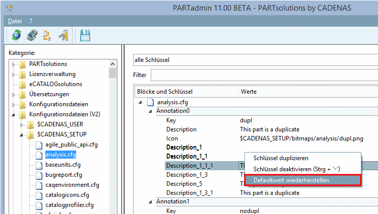 Bei aktiviertem $CADENAS_SITESETUP finden Sie noch den zusätzlichen Kontextmenübefehl Defaultwert wiederherstellen über Werten. Nähere Informationen zum SITESETUP finden Sie unter Abschnitt 1.7.6, „$CADENAS_SITESETUP“.