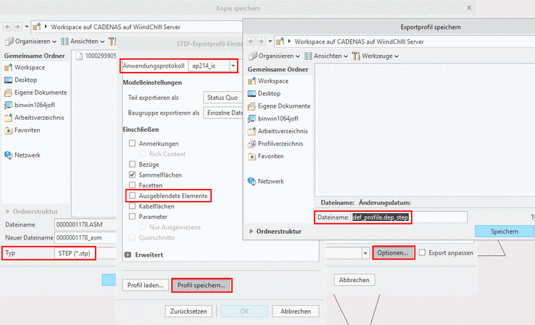 Die STEP-Exportprofil-Einstellungen müssen in Creo korrekt gesetzt sein und das Export-Profil muss korrekt in die