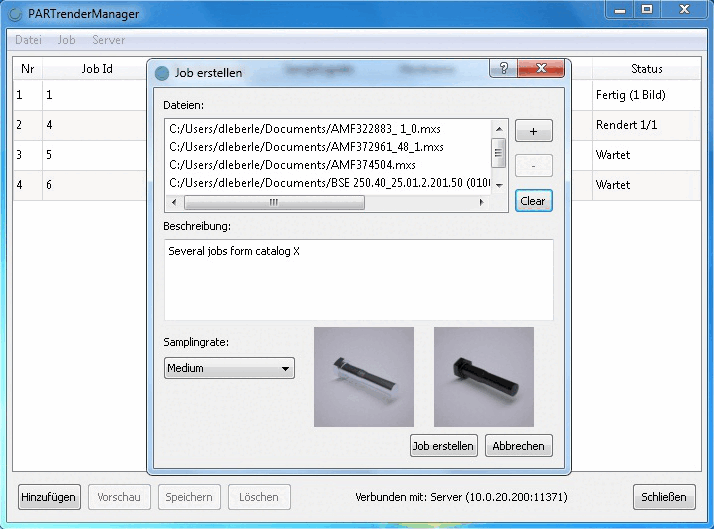 -> Nach Bestätigung mittels wird der Job an den PARTrenderManager Client geschickt und es öffnet sich das Dialogfenster PARTrenderManager. Der in "Auftrag gegebene" Job erscheint im Dialogfenster. Der Dialog Job erstellen [Create a job] wird nicht aufgerufen. Die Beschreibung wird automatisch erstellt. Die Samplingrate kann optional geändert werden, solange der Job in der Warteschleife ist, der Jobstatus also "Warten" ist. Die Liste der Jobs lässt sich nicht mehr ändern.