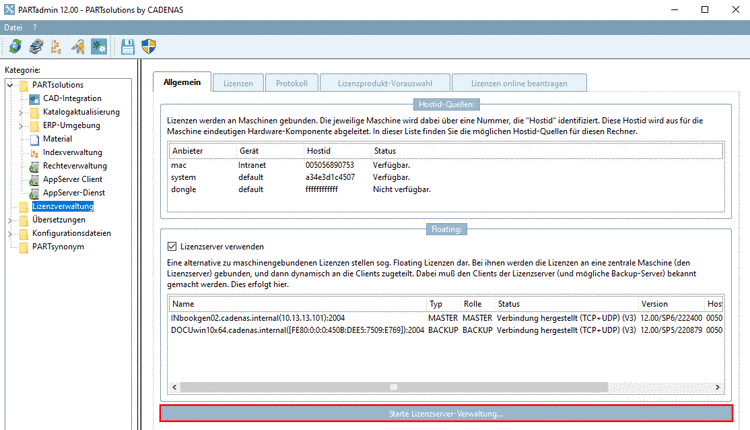 Starten Sie die Lizenzserver Lizenzverwaltung, indem Sie in Ihrer Installation (z.B. PARTsolutions Enterprise) in PARTadmin -> Kategorie Lizenzverwaltung den Button Starte Lizenzserver-Verwaltung... klicken.