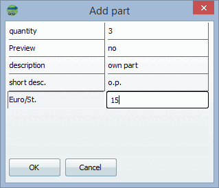 Im Menü Teil hinzufügen [Add part] können Sie Angaben zum betreffenden Teil machen. Klicken Sie einfach mit der linken Maustaste ins jeweilige Feld und nehmen Sie die Eintragung vor.