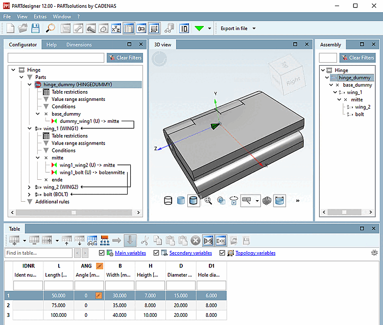 Die Wertebereichsvariable "ANG" befindet sich im Dummy-Teil, welches nicht exportiert wird, aber die Tabelle des Dummy-Teils wird vom Assembly-Tabellenprojekt verwendet. Die Steuerung der Winkelstellung erfolgt so in der Baugruppe.