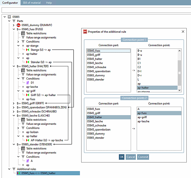 Eigenschaften der Regel [Rule properties]: Lasche auf Haltearm mit Rotation FREI (mit Grenzen)
